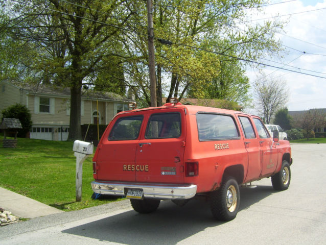 Fabulous Chevy Suburban was former Fire Department Rescue vehicle only 25981 original miles. Very strong runner that runs great and is very dependable sat in Fire Dept garage for years and the body is very solid for the most part. It has some rust couple dents but would make great everyday runner or total restore car show ride. I have owned "Big Red" for almost 3 1/2 years and have only put on myself a little over 1400 miles in that timeand is the most dependable vehicle I have owned in the last 20 years. The 4 wheel drive works great and has back up alarm when you are backing up too. It has heavy duty tires as well. New inspection sticker as well.