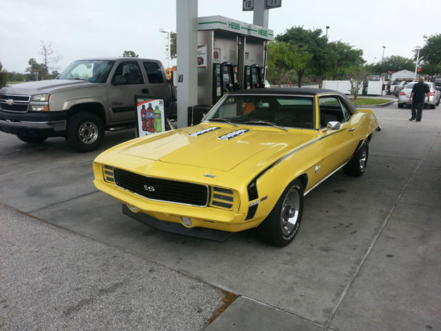Selling my1969 Camaro RS/SS 396. Daytona Yellow with hounds tooth interior. No rust anywhere and car is in great shape. Iwould considerthe car in excellent driver quality condition. Runs andsounds great! It drives even betteridles at 700rpm. Looks to be an all original car with the original 396 has vin stamping on the pad to match vin.12 bolt rear with stock gears. Original AC car needs compressor and condenser to be completed and running but everything from the firewall in is there. New Vinal top new seats door panels headliner and dash. Frame is excellent as you can see from the pictures. All suspension components have been replaced new shocks springs bushings excellent. All the steering and brakes have been gone through. Features Power steering and power brakes. Tires are like new trim rings could use replacing. New gas tank and sending unit. New exhaust with stock mainfolds. Only thing on car that needs attention is the vacuum system for headlights. They were working and have stopped recently. The car is located in south west florida and is available for inspection anytime BEFORE you buy it.