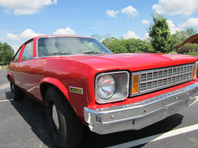 Listing 1978 Chevy Nova. When I found this vehicle someone started to make a race car. It was ashell only no interior no motor inner fenders. But the floor pans and trunk pan in perfectcondition and the body great condition as well.Fortunately was able to locate a 1976 and 1978 Nova parts car. The 76 had all the interior andtrim parts needed the 78 had inner fenders complete uncut wiring harness and other smallaccessories.Interior: has new carpet seats reupholstered perfect dash pad. Everything works heaterwipersturn signals and fuel gauge.Motor: is a 40 over 454 long block professionally built less than 3000 miles on motor.Transmission: power glide with reverse valve body and manual shift. B&M Pro ShiftDriver line: new custom made drive shaft. Rear end completely rebuilt with 373 gear andCompetition Engineering slide a link traction bars.Fuel System: has Summit Racing Stage aluminum intake with Jet Performance Street MasterQuadrajet Stage 2Braided fuel line from new gas tank to the racing mechanical fuel pump 110ghp @ 8psi.Brakes: new rotors and drums with new hardware kits. All new brake lines order for direct fit.Front tires: new Kelly 205/70R15Rear tires: Hoosier Pro Street 28.0/9.50LTNew Chevy Performance HEI DistributorAluminum dual row cross flow radiator with FlexALite electric fan.New Powerforce Harmonic Damper with degree markingsNew FlexALite transmission cooler with braided hoses.New Auto Meter Tach Oil Temperature and volt gauges.The car was repainted July 2014. Excellent paint job.New exhaust from headers back.A very nice car for weekend cruises or just driving around town. Car drives and rides very good. Selling the car because I have not had the time to enjoy it. The car has been driven once this year.Payment is to be made by cash or bank cashiers check only. Full payment due 3 days after sale.Buyer responsible for pick up. The vehicle is being sold as is no warranties expressed or implied. Vehicle is for sale locally have to right to pull auction if sold before it ends.Thanks for looking any questions just email me. cosmot0529@yahoo.com