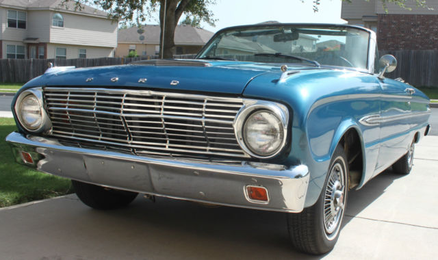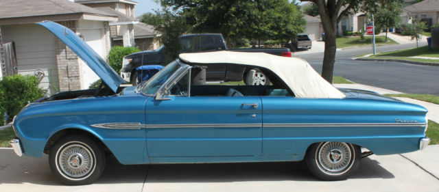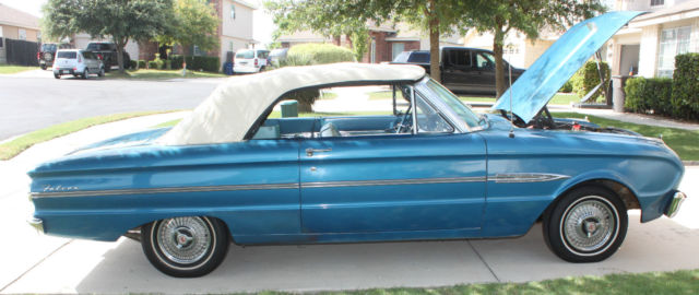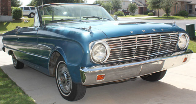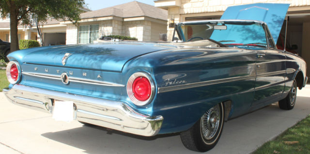 This 1963 Ford Falcon Futura Convertible Classic is in good condition & ready to go out cruising. The top, ights, orn, ipers, ord radio, tc.are all fully functional. The Falcon receives manycompliments & isdefinitely not for those thatdon'tlike attention! She was originallyCorinthian White but painted Blue by a previous owner. Looks Great in the sunlight & is the only time she is driven. She fires right up & drives smooth. Areas that may need replacing or attention are the shocks, anifold seal & has typical rust areas which will be seen in the pics. Thank-you for looking & feel free to send your questions.