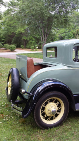 This 1930 Model A Deluxe coupe has been totally rebuilt - frame off restoration. All original and all metal. It is as good or even better, han when new and on the Ford dealers show room floor. Every vehicle part, rame, teering, rakes, ubs, ransmission, ifferential and even the total interior upholstery has been totally rebuilt, eplaced or redone to a new vehicle condition. Under carriage - body and fenders are completely under coated. Engine had been 100% rebuilt by a certified company in NC (Dreamworks) - new crankshaft, ew rods, ew pistons, ll new babbitt bearings (line bored), ew valves and new timing gear. Also, ew ignition switch and wiring, ew spark plugs - coil - points, otor and distributor housing, ew carburetor, nd new dash panel. Added new radiator coolant thermostat and temperature gauge. Car has a new battery, V alternator (+ gr.), ew amperage gauge, ew fuel gauge assembly, ew speed odometer (showing 2700.0 miles since being reborn), ew vacuum windscreen wiper unit, irectional signal light system with indicator lights and buzzer, xtra added LED brake light unit, witched interior under dash light, riving lights (if left on) safety signal buzzer, river and passenger lap seat belts anchored to main frame with added 3" angle iron (main frame to frame) Completely repainted with original Ford colors- body olive green, lack fenders and straw (yellow) wheels. All new tires and spare. VIN numbers all match, ar has clear title and it is licensed at the present time. Sale includes all car parts - crank, ack, es Andrews repair guide text, lus a number of extra parts and supplies.