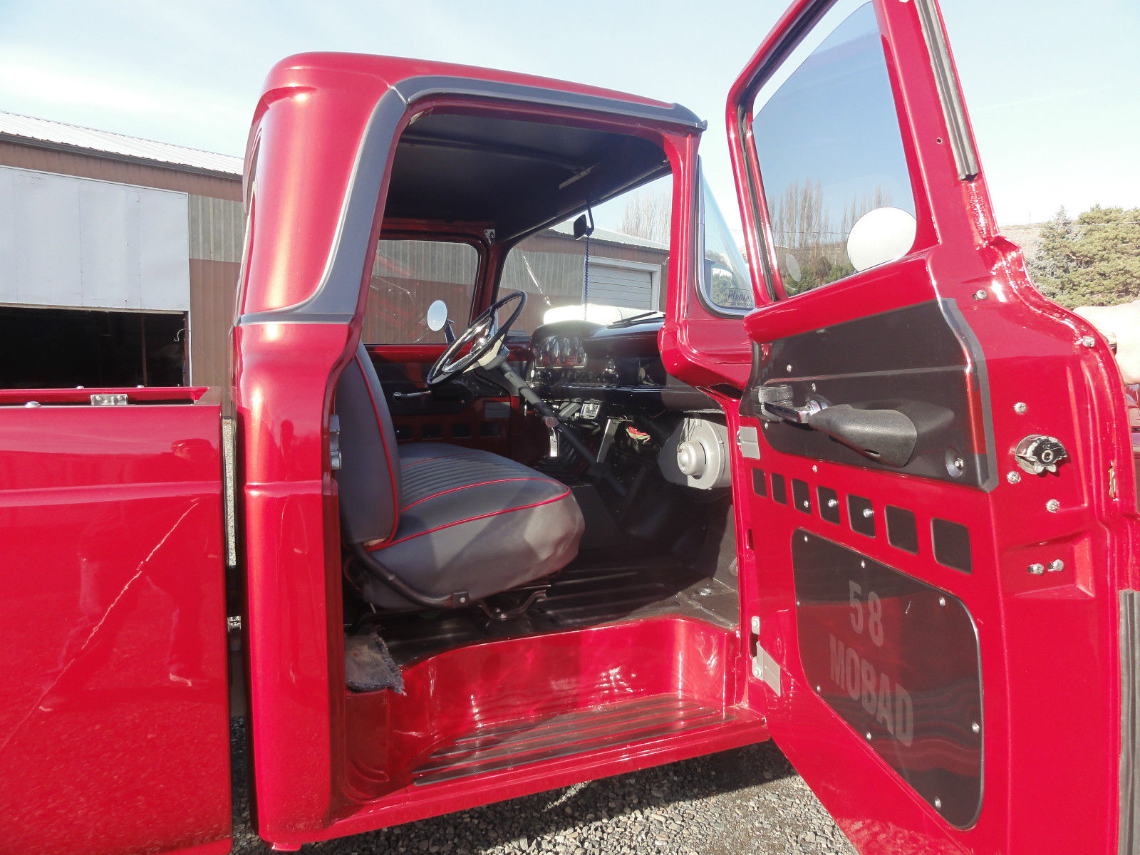 For sale is My 58 MOBAD pickup. Time to start another project. specs are as followed. -1968 390 CI w/ custom cut cam. 650 cfm carb. . 390 gt cast exhaust headers ceramic coated - Euro head lights for better night vision -C-6 Automatic transmission w/ stall conversion. tourqe convetor to match cam drop & loop. shift kit - 370 to 1 rear gear diff. posi trac. disc brakes - Front disc brakes - Custom Doc's Dolphin gauges with tach - No-wing one piece power windows - Tinted rear slider window - Custom flow throw tail gate - Custom blue dot triple tail lights - In bed tie downs - Paint is Lesanol based and clear Orathane - All brakes. inner fenders. wheels. custom flow throw down force tail gate. in bed tie downs. steer coloum matching colors. Color is Orcgard rite hammer gray - Standard leaf spring suspension. extra leaf is front for big block. factory extra heavy over laod springs in rear. 44 total springs under truck - Manual streering box from a 2 ton saganoff steering box - Interior is original custom cab bench seat. Ford Truck logo stitching layed in headliner and carpet. arm rests. both doors and sun visor - Tires are 31 x 10. 50 x 15lt front 8inch wide. rear is 33 x 12. 50 x 15lt 10 inches wide - 3. 00 miles - Clear title in hand contact Marty Ray @ 509-945-8666