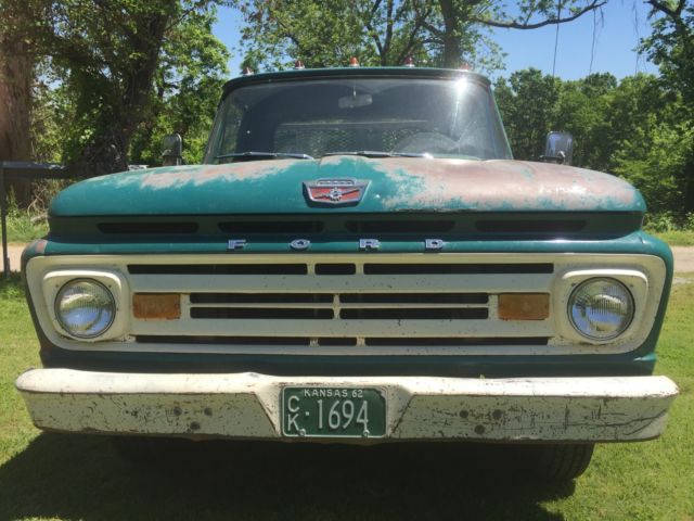 1962 Ford F-350 short wheel base 88 inches, 292 V8, 4 spee, motor runs excellent. Good cab mounts not a rush bucke, small area of rust in lower fenders. All gauges,light, wiper, turn signal, dash lights and heater all work as they should. The factory clearance light blinker button on the dash blinks the glass clearance lights on the roof. Battery box is located on the floorboard and the battery box is solid and not rusted out. As you can tell the front fenders are true one ton fenders by the wheel opening. Truck is not perfec, but drives out real good . New tires on front . If you have any questions or need more pictures call Larry at 620-202-0176