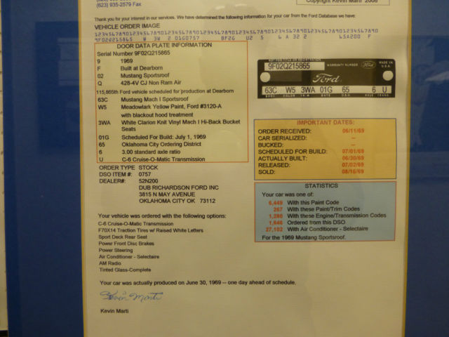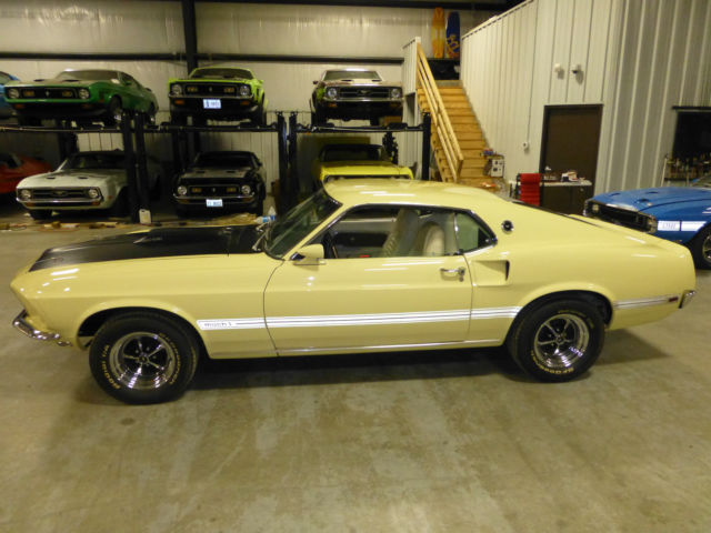 Restored to MCA gold standards by Billups Classic Cars of Colcord. klahoma. He has numerous Division 1 and 2 MCA and SAAC gold restorations to his credit. Original sheet metal and glass. It has been kept in a climate controlled facility since restoration. This 1969 Mustang Mach 1 428cj is a factory Meadowlark Yellow/White Interior with factory air-conditioning. The Elite Marti Report verifies this is a 1of 1 car with these options. Concouse level restoration on a rust free Oklahoma car. Photo documentation of this nut and bolt restoration is provided. Over $60. 00 in restoration receipts. if you have questions you may call me at 918 645 4543. No trades so don't ask. I don't disclose the reserve so don't ask. Deposit of $500 due within 48 hrs of auction end. Balance by wire transfer only within 7 days of auction end. If you arrive to pick up the car and are unhappy with the car for any reason i will refund your deposit. You won't be. this car presents as a fresh restoration. In fact it has not been driven since its completion. Bids will not be accepted by buyers with a feedback less than 10 unless you call me first. I will cancel your bid and block you.