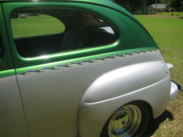1946 Ford Tudor Sedan I have For Sale a very nice 1946 Ford Tudor Sedan Hot Rod. A great starter Hot Rod and Saturday Night Cruiser. It has the Original Flathead V8 and Three Speed Column Shift Transmission that have been rebuilt. The interior is complete and looks to be the original and is in used condition. New seatbelts have been added for safety. Car is a great cruise-in car with plenty of room for the whole family. Car runs and drives great. has almost new tires on chrome rims. All lights and turn signals work as they should. Car has been converted to 12 volt with an alternator. Air Conditioning? No just roll the windows down. open the cowl vent and cruise!!!! The car has been very reliable and we have enjoyed cruise nights in it with the grandkids. The 46 Sedan is a fun reliable hot rod that gets plenty of thumbs up going down the road. Body and paint are in great condition except for one spot on the passenger fender that I scraped while loading on a trailer (see pictures) the Green and Silver look great together and the purple flame stripping really accent the color combination. This is a very solid rust free car that has been fun to own and enjoy. I am selling the car to start another project and we have truly enjoyed owning it. It's time someone else gets a chance to enjoy a cool old hotrod for a minimum cost. Car will be sold as is no warranty expressed or implied. Buyer is responsible for all shipping arrangements and cost or can be picked up locally. Winning bidder is to pay a $500. 00 Dollar Non-Refundable Deposit through Paypal within 24 hrs. of auctions end.